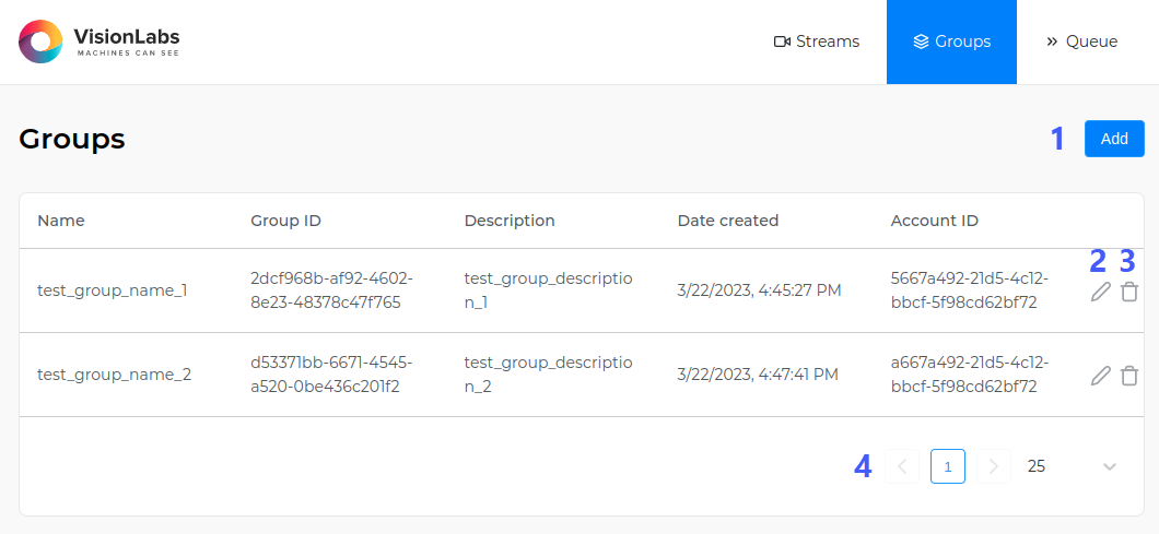 • Number of groups displayed on the page is set by the radio button in the lower right corner of the page. There can be 10, 25, 50 or 100 groups on one page (4).