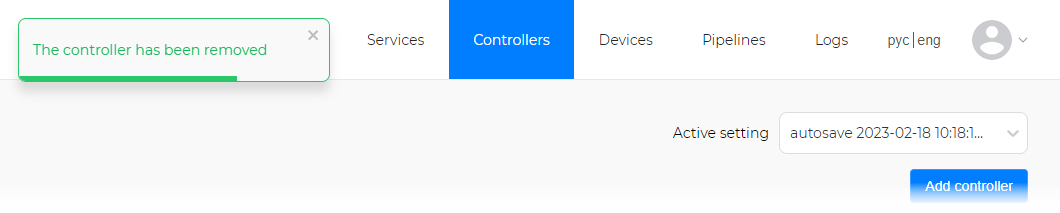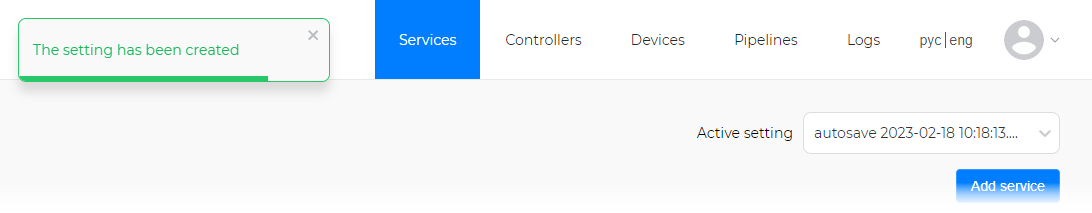 If the setting was created and imported correctly, then switch to this setting and check that all the components contained in this setting are displayed in the corresponding sections: Services, Controllers, Devices, and Pipelines.