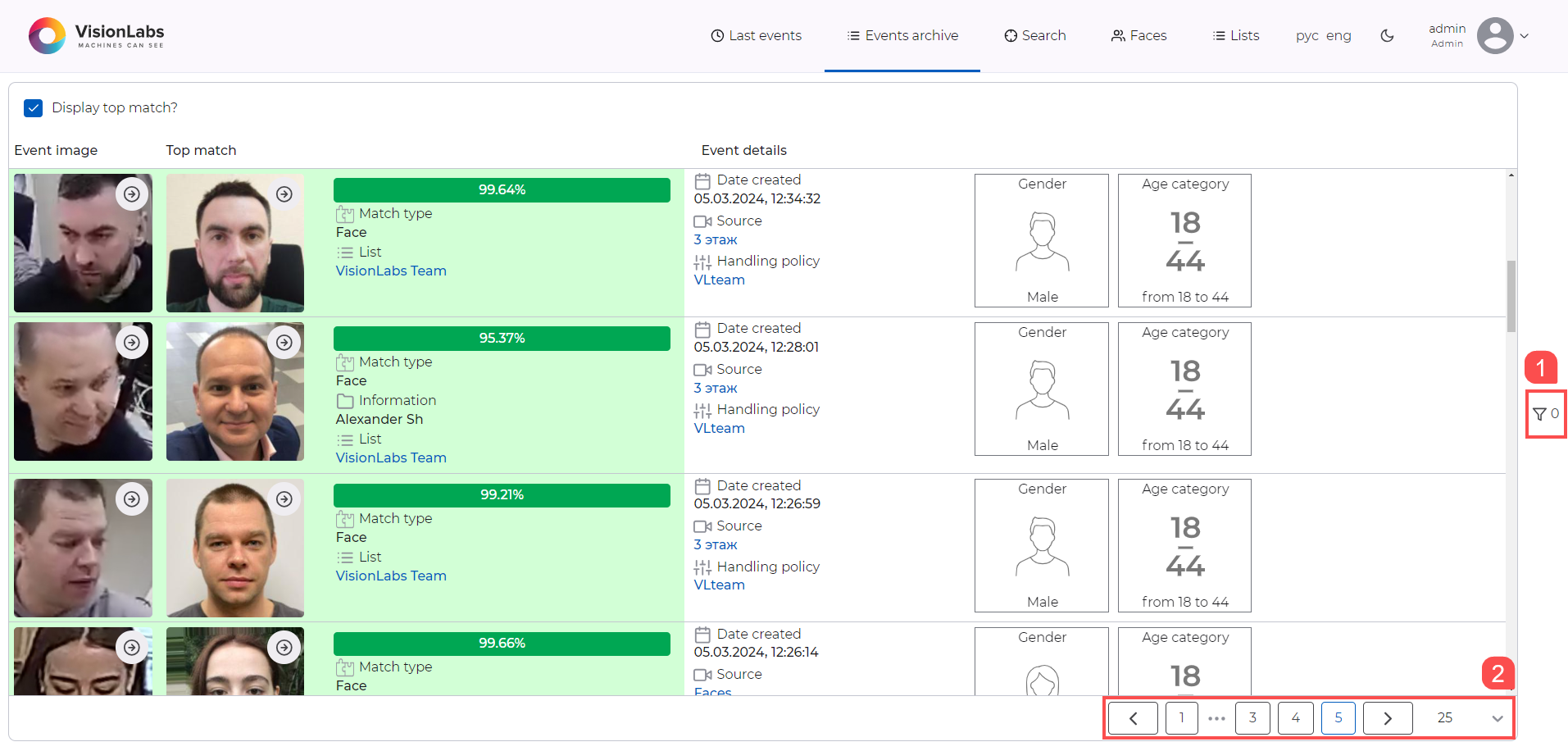 If there are no filters applied (1), the Service displays the latest detection and identification events identical to those presented in the “Last events” section, as well as events created earlier.