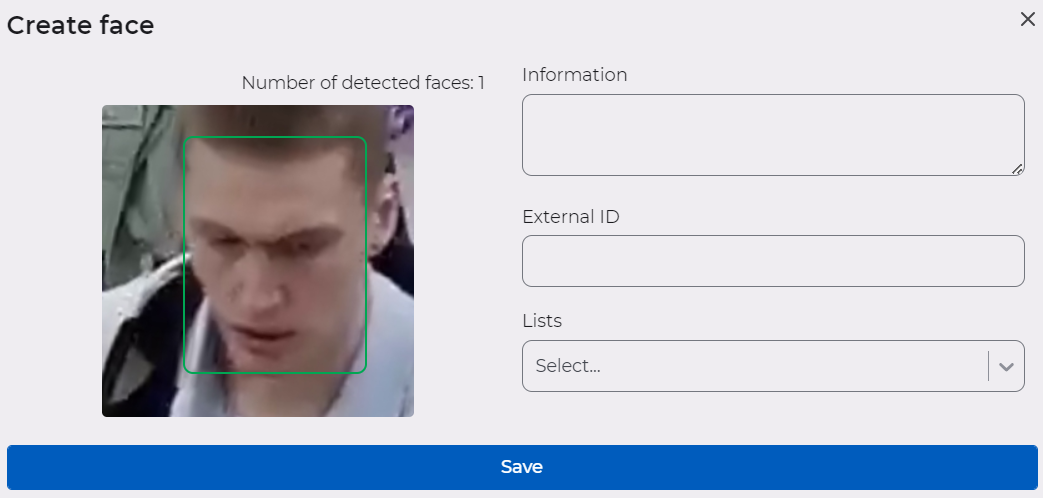 “Face” type — “Information”, “Lists”, “External ID”. “Event” type — “Handling policy”, “Source” with the ability to go to the handling policy editing page and view the stream from the source in real time |