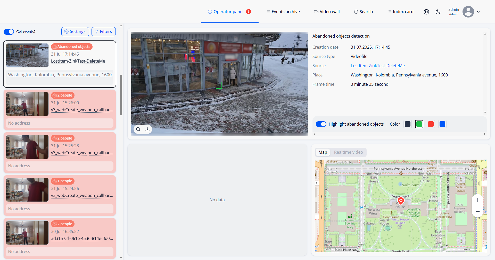 The “Operator panel” section displays events of face and body recognition (Figure 7) as well as video analytics events (Figure 8). Receiving and displaying events is performed with minimal delays in near real time.
