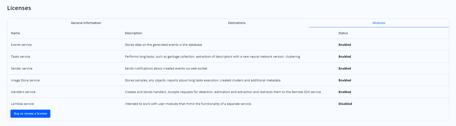 “Modules”–shows the status (enabled/disabled) of service licenses for (Figure 102):