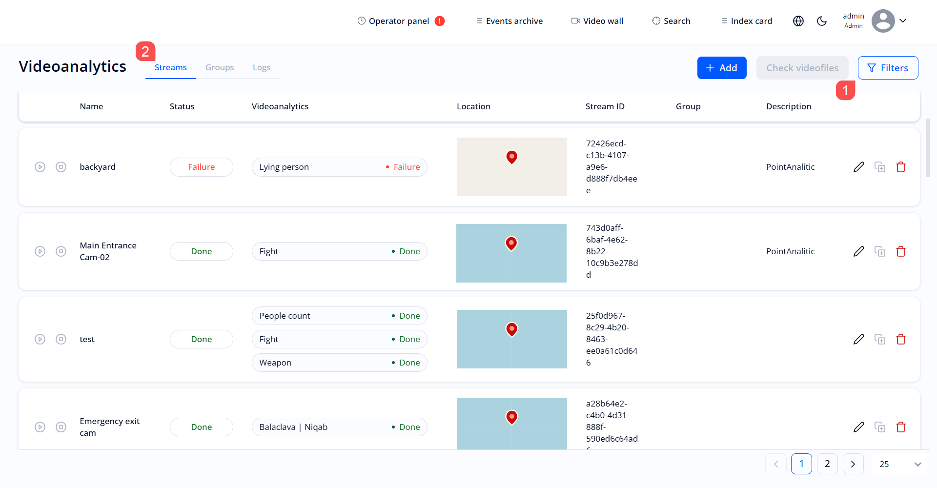 - Filters—for searching streams. Click the button (1) and filter streams by status, video stream name, or group.