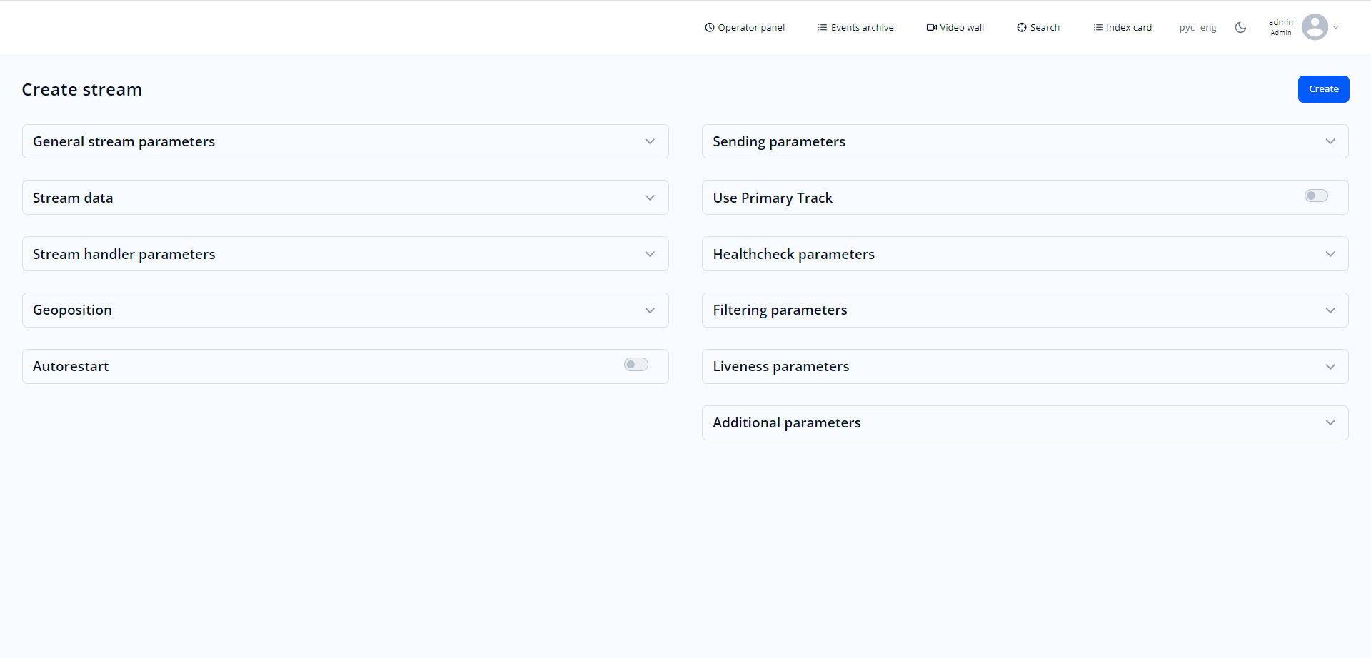 To add a video stream, click on the “Add” button (Figure 76). “Create stream” form will open for specifying the settings (Figure 78).