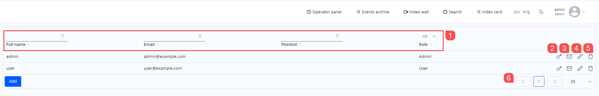 Search and filtering of accounts is carried out using the fields: “Full name”, “Email”, “Position” and “Role”.