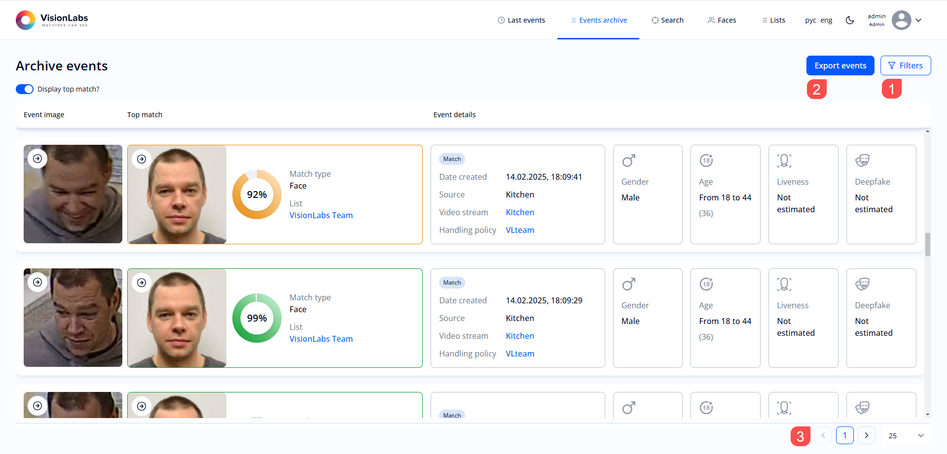 The “Events archive” section is designed to display all events of face and body detection as well as recognition and search for events in archive (Figure 8).