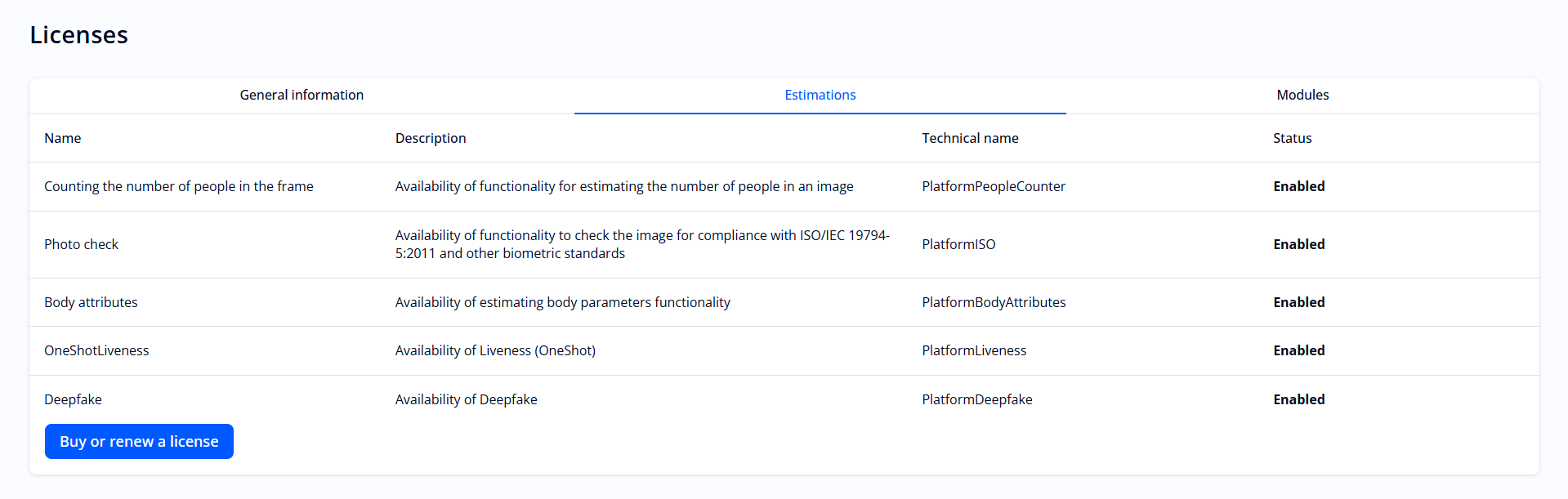 “Estimations”–shows the status (enabled/disabled) of licenses for (Figure 89):