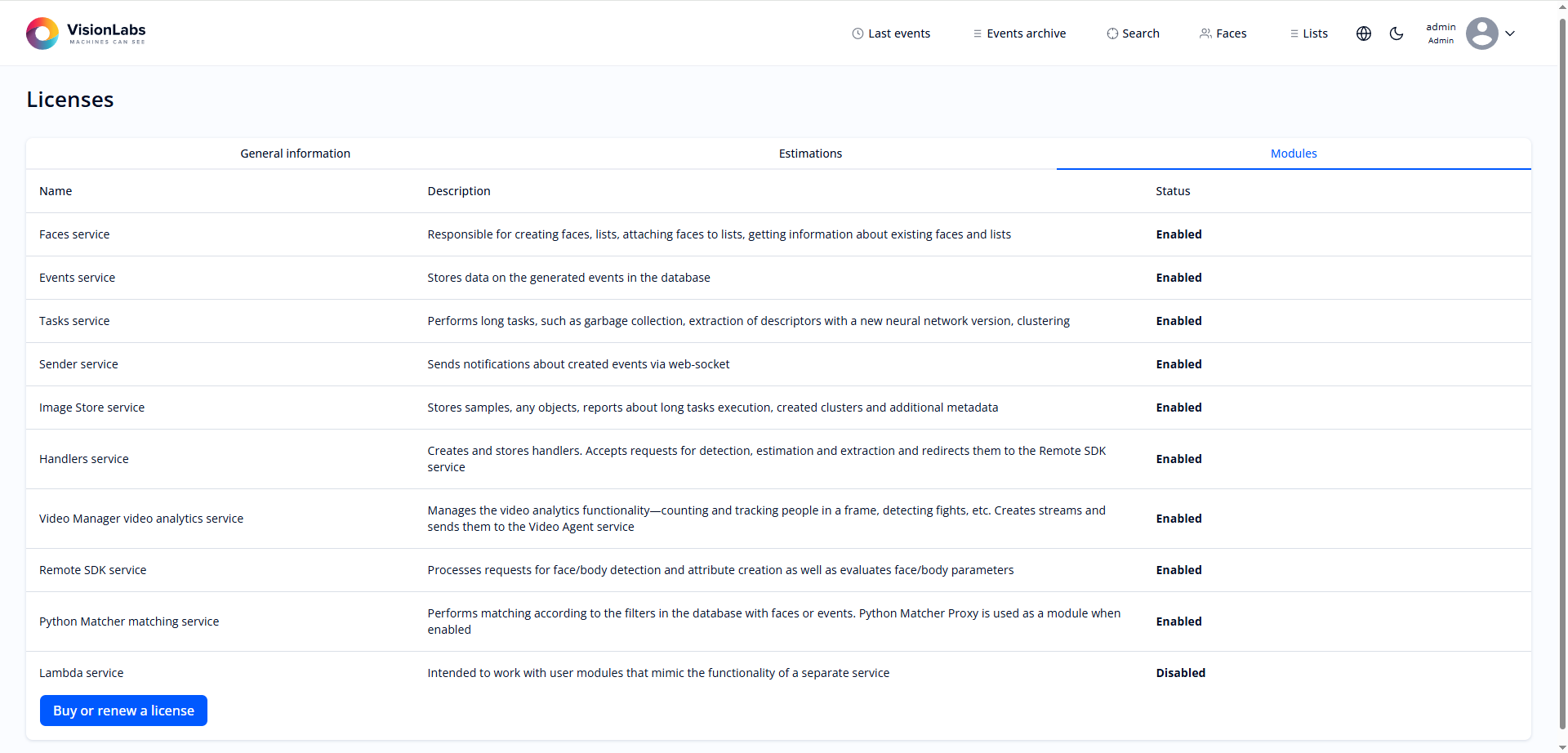 “Modules”–shows the status (enabled/disabled) of service licenses for (Figure 90):
